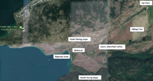 The location I have selected for my field research project is Cosens Bay in Kalamalka Lake Provincial Park, Vernon BC (50011’44” N, 1190 15’40” W) (Figure 1). There is a hiking trail that extends approximately 2.5 km from the car park west, downslope towards Kalamalka Lake. On September 25, 2019 between 17:20 and 18:45 it was 15 degrees Celsius and cloudy. Several ecological communities are present (including forest, grassland and riparian communities) within the Cosens Bay area, of which are associated with the following features: the riparian area of Kalamalka Lake, adjacent wetland, open disturbed grassland, gulley features, south facing slope with an open canopy and a north facing slope. Given the environmental gradient at the site there are several differences in ecological communities to observe.