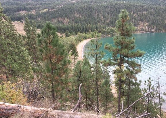 North of the riparian area is a south facing slope extending up to 700 m asl dominated by ponderosa pine (Pinus ponderosa) with some interior Douglas fir trees (Photo 3). The tree canopy is relatively sparse as the elevation increases to 700 m asl with an understorey dominated by bluebunch wheatgrass (Pseudoroegneria spicata). Areas of exposed rock are present indicating shallow soils.