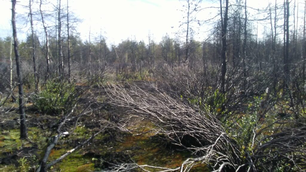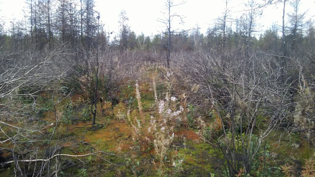 While visiting, the weather was sunny, and 16C. The terrain appears, for all intents and purposes, to be flat, although most peat bogs are known for being either domed, or gently undulating. The particular area that I first explored showed signs of having been subjected to fire in the passed few years. This observation is in line with what I would have expected; in July of last year, I observed the first signs of what was most likely the fire that caused the damage I was currently observing, while I worked at Kwantlen Polytechnic University’s Garden City Land’s farm in 2018, which is located on the parcel of land just west of the DND lands (west of Number 4 Road).