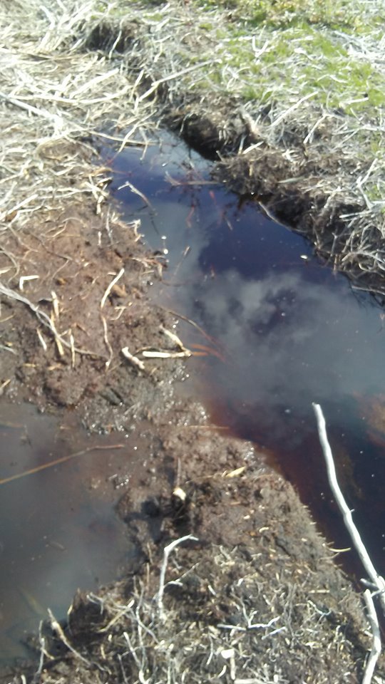 (Above images: images of effects of fire on the bog, as well as what I suspect are most likely tire tracks left by firefighting vehicles. The second images over from the left is of particular interest, because this may be one of the spots where subterranean fire followed a root to the surface, where it likely ignited surface fires.)