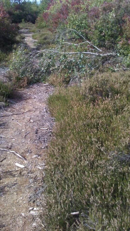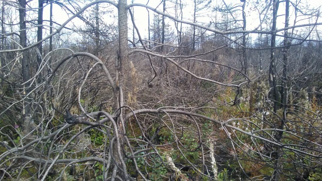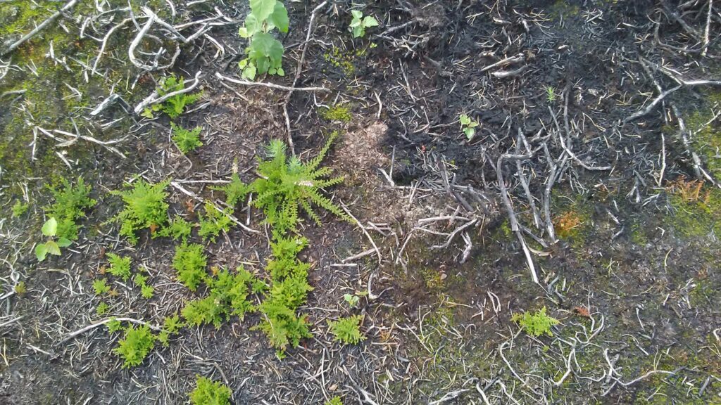 What struck me about this particular peat-land, besides the blackened Vaccinium spp. shrubs, and shore pines (Pinus contorta var. contorta) (1), was the abundance of invasive Scotch heather, Calluna vulgaris (2), which was regenerating vigorously after only a year since the bog fire took place, along with the proliferation of the seedlings of another alien invasive species, the European birch, or Betula pendula (3). In many places it appeared as if the two species were the primary pioneer species on burnt and exposed sphagnum based peat soils. It also looked as if a lot of the primary fuel for burning may have come from a dense under-story of low shrubs, because the trees and Vaccinium spp. were burnt from the bottom upwards. In a few spots I did notice black pits surrounding larger trees and shrubs that had died from burning, and I suspect that this is where subterranean peat fires may have followed dead roots to the surface, where they may have broke out, and ignited surface fires amongst what appears may have been dense, fine branched, low growing, woody vegetation, most likely Ericacious.