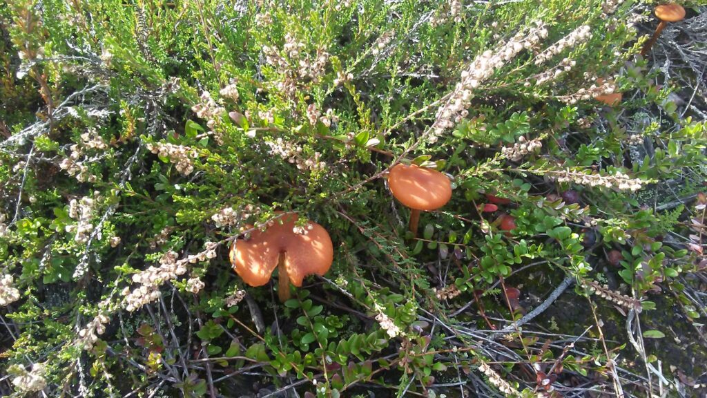 (Above images: Images of vegetation within the bog, clockwise from left to right; Vaccinium spp., cranberry, have yet to confirm the species, young Scotch heather, Calluna vulgaris, colonizing fire effected area, mature C. vulgaris growing with an unknown fungus, northern Labrador tea, Rhododendron tomentosum (4), growing in a cut over firebreak close to burned area, mature C. vulgaris growing beside a trail in part of the bog that was not effected by the fire, and a C. vulgaris seedling growing in the wheel-track of what I’m assuming was a firetruck.)
