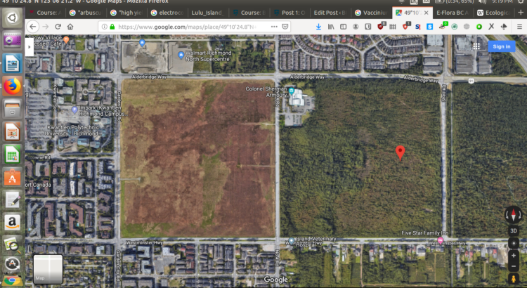 The site that I selected was the peat-lands in the DND Lands in Richmond, BC, between No. 4 Road, Shell Road, and the Westminster Highway. The coordinates for my initial observation point were 49°10’24.8″N 123°06’21.2″W, and my first observations were conducted at 12:15PM, on Sunday 29th of 2019. This particular portion of peat-land does not have an official geographical name; however, it has historically been considered a part of the greater Lulu Island Bog.