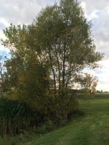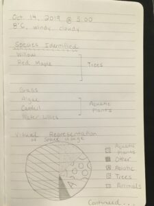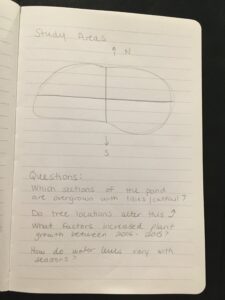 I am still brainstorming a concrete hypothesis but it will largely surround habitat space use from varying species in our pond and how the presence of one may effect another. Below are initial notes taken on October 4, 2019 along with photos of my study areas. (Figure 3- ). The graph in Figure 3 exemplifies a visual representation of the space utilized by varying factors in the pond, I will soon create a chart and more accurately record this data. Also note I am still working to identify two of the tree species. The drawing in Figure 4 represents how my study is going to be divided directionally, taking into account wind patterns, tree locations and how the pond is utilized by which species in each specific location.