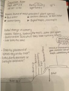 I returned to the study site on September 28th, 2019 between 09:00 and 11:00. It was partly cloudy with light winds, and approximately 12 degrees Celsius. The biological attribute I plan to study is the relationship between tree species and the river. I would like to focus whether there is a correlation between the type and abundance of trees and shrubs, and the proximity of the river in regards to each species.