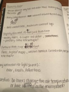 Gradient 3: 40-60 feet from the river bed, elevated about 15 feet. Various species of Maple, including Bigleaf and Vine Maple dominate this area. Need to research and return to the site to see if there are other types present, as it can be difficult to distinguish since there is a high density. Western Hemlock and Cedar are present in larger numbers and density than gradient 2.