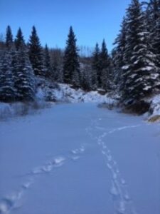 In my study area at Fish Creek, I have noted frequent traffic by large mammals in the form of tracks in the snow. I have decided to study the patterns of travel used by the area’s large mammals. Specifically, I will be focusing on Odocoileus hemionus, Canis latrans, and Vulpes vulpes. Though I have noted the presence of Alces alces tracks, I believe them to be too intermittent of visitors to the area to use as a focus species, though I will continue to note their presence.