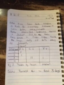 Based on my observations, my hypothesis is that Odocoileus hemionus, Canis latrans, and Vulpes vulpes will use the north facing slope most frequently for travel in the winter months. I predict that as snow continues to fall over the winter months, the open south facing slope, gully bottom, and the top of the southern (north facing) slope will house the deepest snowpack of the gradients, while the mostly covered southern mid slope gradient will have less snow accumulation on the ground. I believe this will lead to heavier traffic from large mammals, seeking easier travel routes. Based on the above, the response variable will be the abundance of Odocoileus hemionus, Canis latrans, and Vulpes vulpes tracks present at any given gradient (categorical). The predictor variable will be snowpack depth at the different gradients (continuous).