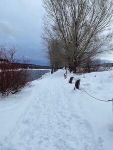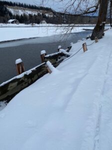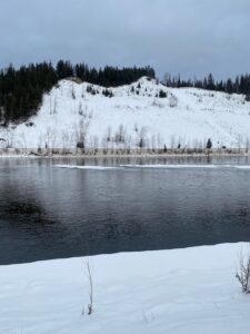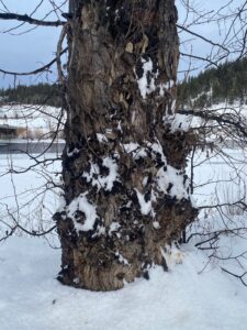To begin my observations, I walked the western portion of the trail on December 17, 2019, from 12:00-12:50pm. The sky was overcast, it was very windy, and was approximately 4 degrees. There was a big snowfall on the previous day, about 10-20cm, but it is already starting to melt due to the temperature. This park, as one could likely have guessed, contains many cottonwood trees. There are big veteran cottonwood stems all along the river bank, as well as many regenerating clones in the understorey.The understorey vegetation is surprisingly limited for a seemingly wet site. The only noted species were red-osier dogwood, black hawthorne, saskatoon berry, mountain ash, rose, as well as some different grasses. Parts of the river are frozen at this time, but only at the edges or in shallower areas. There isn’t much as far as animal signs, other than squirrel sightings today. However, as I do spend a lot of time here, I have seen chickadees, magpies, ospreys, hawks, eagles, hares, foxes, and bears during other visits. There are many signs of erosion here, as the trails have had to be moved in some spots, the retaining walls have begun to fall, and the concrete is cracked and broken throughout.