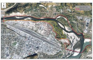 For my field observations, I have chosen Cottonwood Park in Prince George, BC. This is an interesting area, as it is a city park where the Fraser River and the Nechako River meet, but the majority of my study area only includes the Nechako river. This area is a river bottom, which is surrounded by industrial sites on the south side, and a very steep cut bank on the north side. My study area is in the SBSmh and is approximately 200 hectares in size, which includes the area of the adjacent rivers, but my observations will mainly occur on a 4.8km trail that I walk regularly (Figure 1).