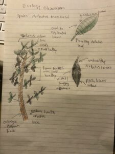 The organism I am studying is the Arbutus species native to southern British Columbia and the Pacific Northwest in the USA: Arbutus Menziesii. The biological attribute I am examining is the health and colour of the foliage of the tree, as Arbutus trees in this area seem to be in varying health dependent on location (the environmental gradient).