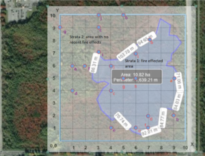 The burnt area of the bog in the DND lands will constitute one sampling strata, and the unburned area around it, delineated by a square boundary, will constitute the other sampling strata. Each strata contains 10 samples, selected randomly by drawing lots (separately and independently for each strata).