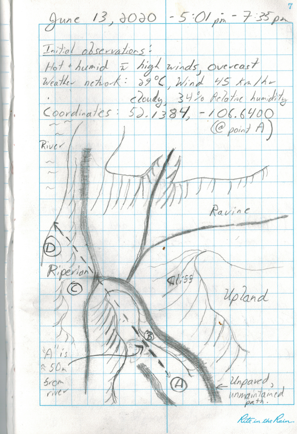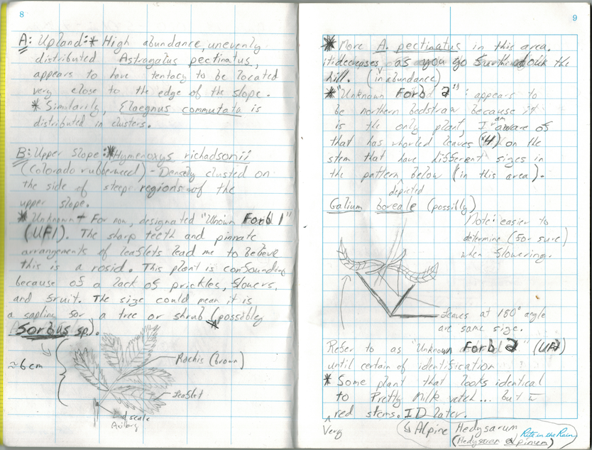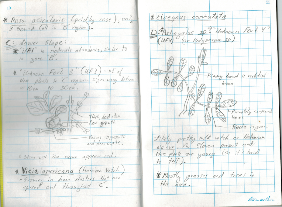 Does the river regularly flood the low riparian zone where forb species are lower? I wish I could read your field notes but they are too small, looks like some detailed and interesting drawings!