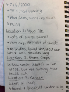 The three areas I’ve selected area: the wood pile, the stone stairs, and the garden. Today the snakes are staying inside the cracks in the stone steps, this is a good place for them to be today since they’re out of the sun and the temperature is much cooler than the wood pile or garden. This distribution is different from the usual as the snakes are usually found in the wood pile or garden, most likely because there is an abundance of food (insects, small rodents, toads, etc) in these areas.