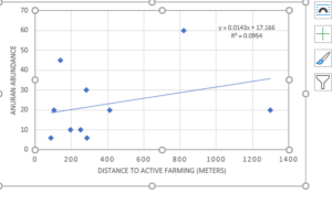 I am presenting my nitrate levels at each location in a table. I plotted my distance to farming (independent variable) on my X-axis and the number of anurans on the Y-axis (dependent) variable. The correlation to farming and species abundance that I predicted, does not appear to exist. PEI has been more involved in the past 20 years of restoring wetlands, establishing guidelines, and enforcing best management practices for the farming industry, which is a possible explanation as to why there is no correlation. I am hoping to return to my same job next summer as a wildlife technician and using this framework to set up another abundance study, to include all amphibian species on the island, not just anurans.
