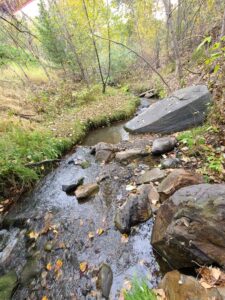 I visually broke up the area into three zones and followed a transect line along the edge of the trail. I recorded for 1 meter x 1metre plots just off the trail at the start of each zone. The meadow begins at the start of the trail. The forest begins at the same spot on the other side of the trail and the field begins where the forest thins and I can see the open field through the trees.