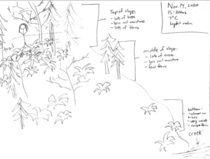 I visited the ravine again on November 14th at around 15:30 hrs. It was a cloudy day again with some light rain and a temperature of 7°C. I decided to focus my observations on the ferns this time and also chose the slope as my environmental gradient. From my research, I was able to identify the species of ferns as Polystichum munitum, or the western sword fern. I also took a different route at the top of the ravine to get a different view and to see if I still noticed the pattern of the ferns being more abundant higher up and away from the creek.