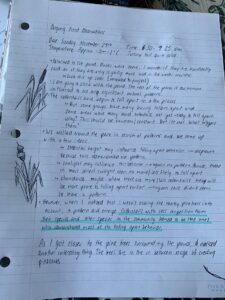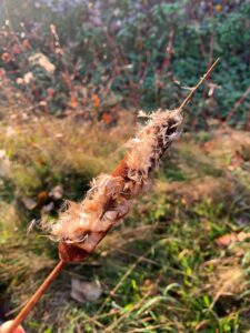 I may choose to study the cottontails that surround the pond. There is a large amount of them in varying abundance in different groups around the pond. During my last visit, I noticed that some of the cottontail heads are beginning to fall apart, which I assume is for reproduction similar to how dandelions reproduce because they seem to fall apart into white fluff that seem like seedlings. However, some groups have many cottontails that have fallen apart or began to fall apart easily upon some light shaking and tapping with a stick. Other groups in the pond had cottontail heads that were still very firm and remained that way with similar shaking or tapping. After considering variables such as cottontail height, sunlight, cottontail abundance, and moisture, there did not seem to be any patterns. I later realized that I was not taking into account the pine trees as part of the abundance, and noticed that it seemed that the more crowded an area was, the less likely it was to have cottontails that were falling apart. I hypothesize that the cottontails that have less vegetation nearby and therefore less competition fall apart and reproduce faster, ensuring them better success and fitness, because they have better access to the available nutrients in the ecosystem. My prediction is that cottontails in less crowded areas would fall apart earlier and cottontails in more crowded areas would fall apart later in the season. Possible response variables could be the degree to which the cottontails have fallen apart (continuous) or the ratio of cottontails that have fallen apart versus stayed intact (continuous) and the possible explanatory variable could be number of cottontail heads in a given study area (continuous), number of trees and distance from the identified group of cottontails (continuous).