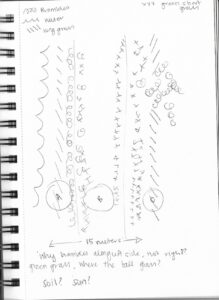 2. That being said, I chose three parts of the dyke. The first is along the water with the left slant of the hill, the top of the dyke pathway, and the right slant of the hill along the farm border. From the water to the farm border is about 15 meters with 5 meters in between each spot.