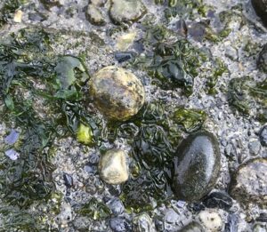 From the big rocks down through to the edge of the water, I found many shells both whole and in fragments. I could identify lots of mussel and oyster shells, and fewer clam shells. (Fig. 3) Living examples of all of those were in the wet intertidal zone. (Fig. 4) Towards the bottom of the sandy beach, very little sand was visible because of the amount of small pieces of shell.