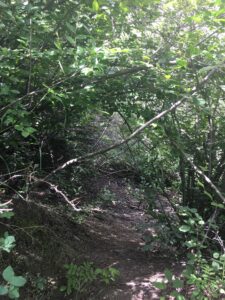 This area is covered in numerous trees densely grown. Heavily shaded undergrowth due to the lush canopy of leaves provided from the trees. Trees and grass/shrubs in undergrowth are fully green and in bloom. The little creek has clear water slowly, and trickles down the creek that has rocks as its base.