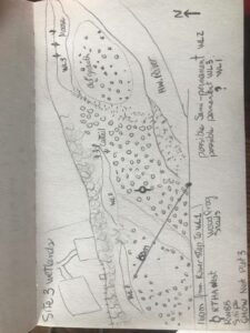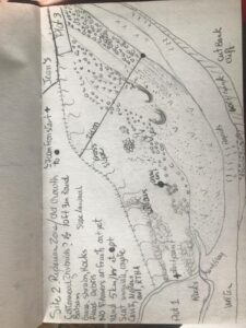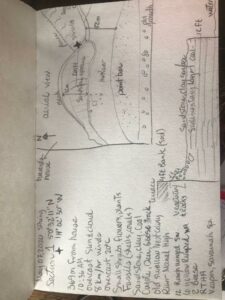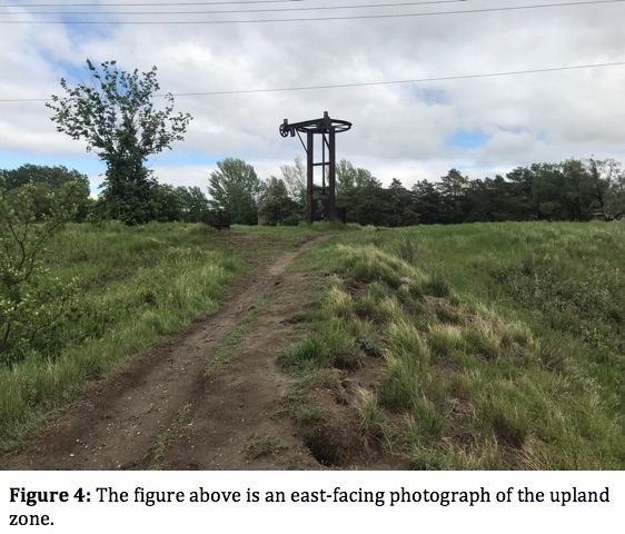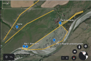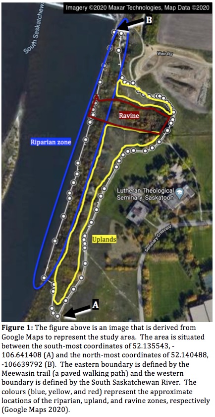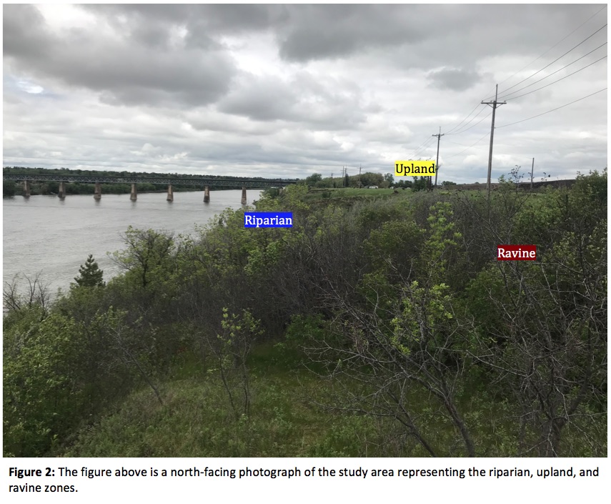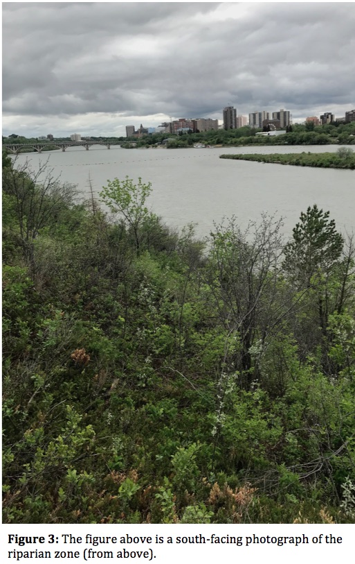 The area that I have chosen to observe is a narrow stretch of civic land (approximately 38 576 m2 in size) located between the University of Saskatchewan and the eastern side of the South Saskatchewan River in Saskatoon Saskatchewan. The coordinates of the South-most point of the study area are 52.135543, -106.641408 and the coordinates of the North-most point are 52.140488, -106.639792. The site was first visited between 1515 and 1850 on June 7, 2020. During the visit, the weather was overcast with sporadic drizzle, high winds, and a temperature of 14OC. Observing the area revealed that there are three distinct areas (the riparian zone, the uplands, and the ravine) (Fig. 1, Fig. 2) divided by their elevation, vegetation, and vertebrate species. The uplands sit approximately 20 meters above the river surface and transition to a riparian zone over a steep bank. Furthermore, a ravine (serving as a swale for the University of Saskatchewan) resides in the northern region of the study area.