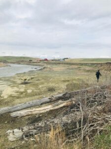 The upland region of the study area is flanked, on the eastern side, by a paved walking path (the Meewasin Trail) that has several meters of grass cut around it. Beyond the cut grass is an area characterized by (mostly) low-lying wild flowers, grasses, and shrubs (Fig. 4). Aside from grasses, the dominant vegetation species appeared to be Saskatoon berry, Elaeagnus commutata (wolf willow), and Astragalus pectinatus (narrow-leaved milkvetch). Similar to observations in the riparian zone, very few arthropods were observed in the uplands. However, multiple ticks (likely Dermacentor variabilis) and indicators of insect foraging were present on vegetation. Anecdotally, the abundance of Cynipid wasp galls appeared to be higher in the uplands than the riparian zone. In addition, there were fewer songbirds observed in the uplands than in the riparian zone. Furthermore, aquatic vertebrate species were replaced with Corvus corax (ravens), Corvus brachyrhynchos (crows) and Pica hudsonia (magpies). In addition, many Urocitellus richardsonii (Richardson’s ground squirrels) were present in the area.