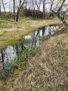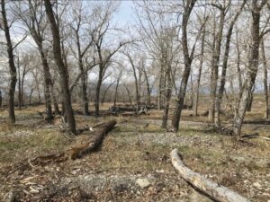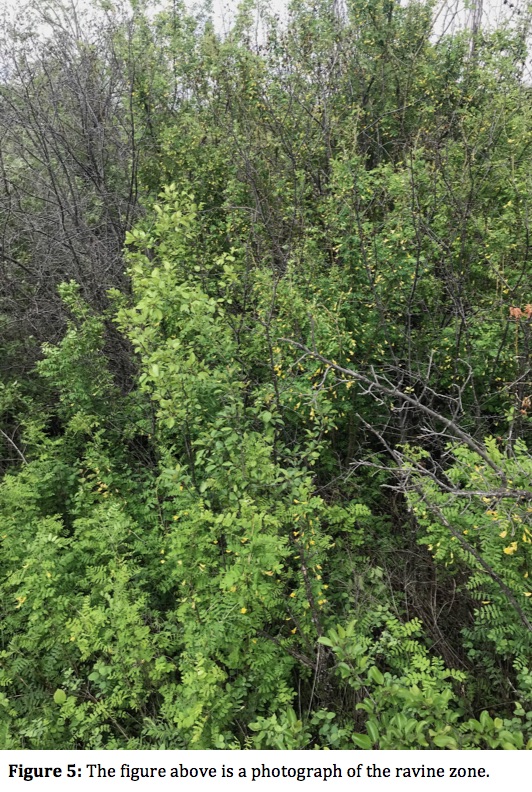 The final area to be observed in the study region was the ravine. As the remnants of equipment and a placard close to the location indicate: it used to serve as a ski hill. The area now serves as a swale for the University of Saskatchewan. A shallow creek runs through the bottom and the area is surrounded by dense vegetation that is mostly composed of box elder maple, Caragana, and Populous balamifera (balsam poplar) (Fig. 5). The interior area of the ravine, superficially, appeared to have it’s own vegetative composition. However, as the ravine extended towards the river, it adopted a vegetative structure similar to the riparian zone. In addition, there appeared to be a high level of black knot fungus infecting the trees of this region.