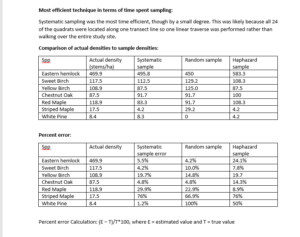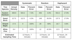 Overall the four species in Table 1, it appears that random sampling was more accurate than systematic sampling and haphazard sampling. Haphazard sampling was more accurate than systematic sampling where there was a greater population, but had a greater percent error for the Striped Maple and the sample percent error for the White Pine.