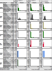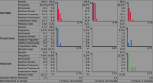 The two most rare species in the study area were striped maple and white pine. For striped maple, the haphazard sampling method yielded a 100% error, the systematic sampling method yielded a 31.4% error, and the random sampling method yielded a 42% error. For white pine, the haphazard sampling method yielded a 98% error, the systematic sampling method yielded a 185% error, and the random sampling method yielded a 49% error. The systematic sampling method was most accurate for the striped maple; however, the random method wasn’t far off. In the case of the white pine, the systematic sampling method was extremely inaccurate and the random method was the most accurate. The haphazard method was extremely inaccurate in both cases.