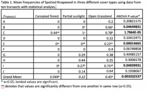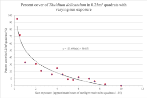 I presented my data summarizing the relationship between mean Canada goldenrod density and level of sunlight exposure in a bar graph. I graphed the mean density (number of plants/m2) as a function of the site along the ecological gradient (low, moderate, and high sunlight). This method allowed me to represent the average value from the 10 quadrats in each stratum, as well as include an error bar to indicate the variance (SE). Additionally, I was able to include the results from my one-way ANOVA and post-hoc Tukey’s HSD test within the figure, by indicating significantly different results with different letters above the bars. The only challenge I had when summarizing my data was converting all density values to a per m2 basis. The data I collected represented the number of plants in a 0.25m2 quadrat. However, I thought presenting it as a more common measurement of number of plants per m2 would be easier to interpret on a graph. As such, I had to convert all of my data accordingly and ensure that my statistical analysis and SE values utilized the same values.